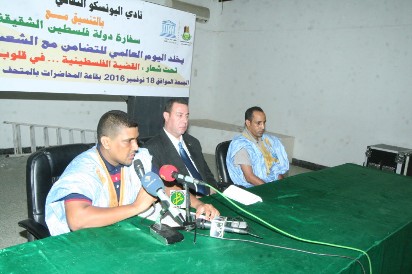 نظم نادي اليونسكو الثقافي الموريتاني بالتعاون مع سفارة دولة فلسطين فى نواكشوط مساء اليوم جمعة بقاعة المتحف الوطني ندوة تضامنية مع الشعب الفلسطيني تحت عنوان " القضية الفلسطينية.. في قلوب الموريتانيين". وأكد رئيس نادي اليونسكو الثقافي الموريتاني السيد محمد ولد عبد اللطيف